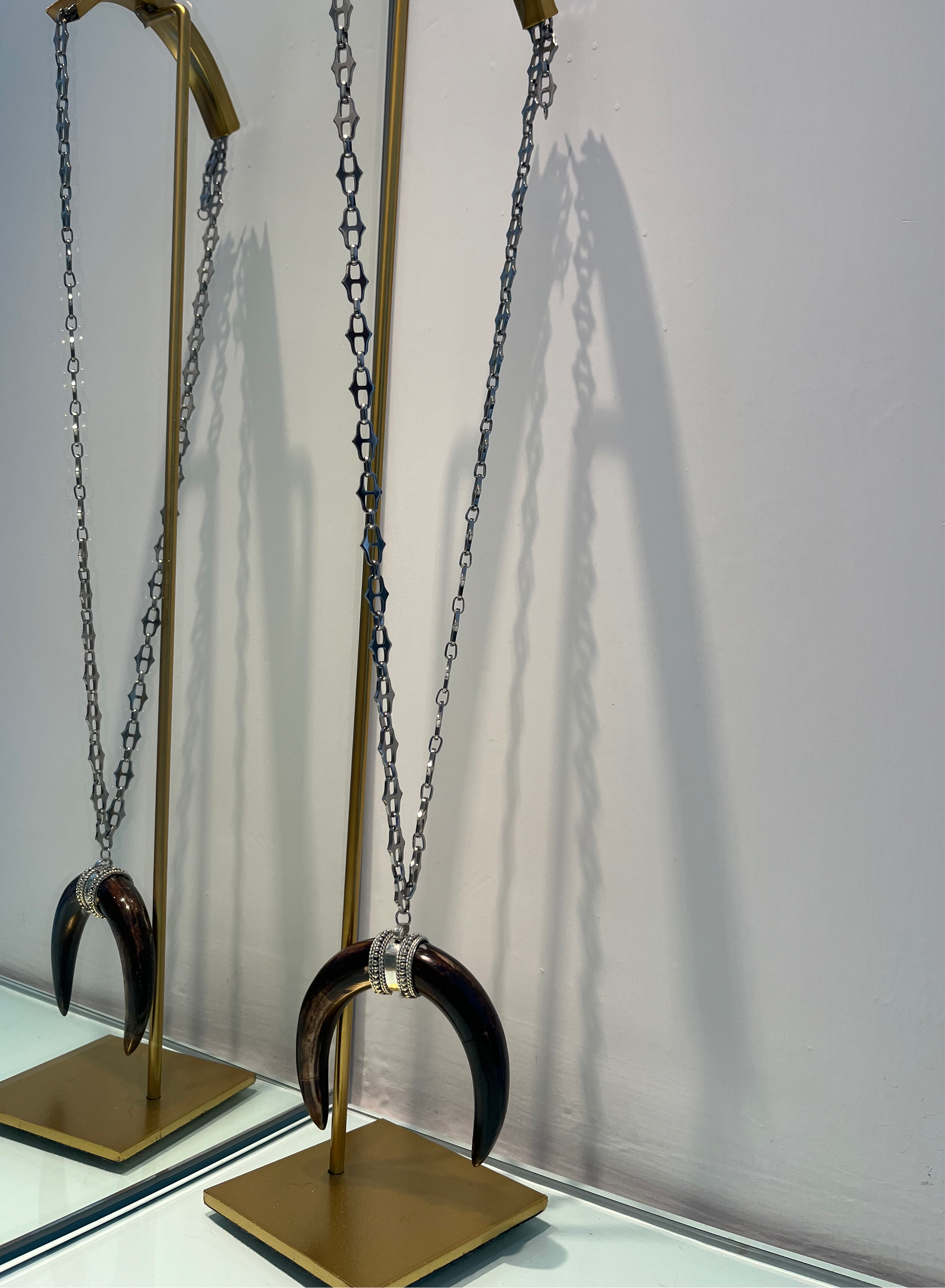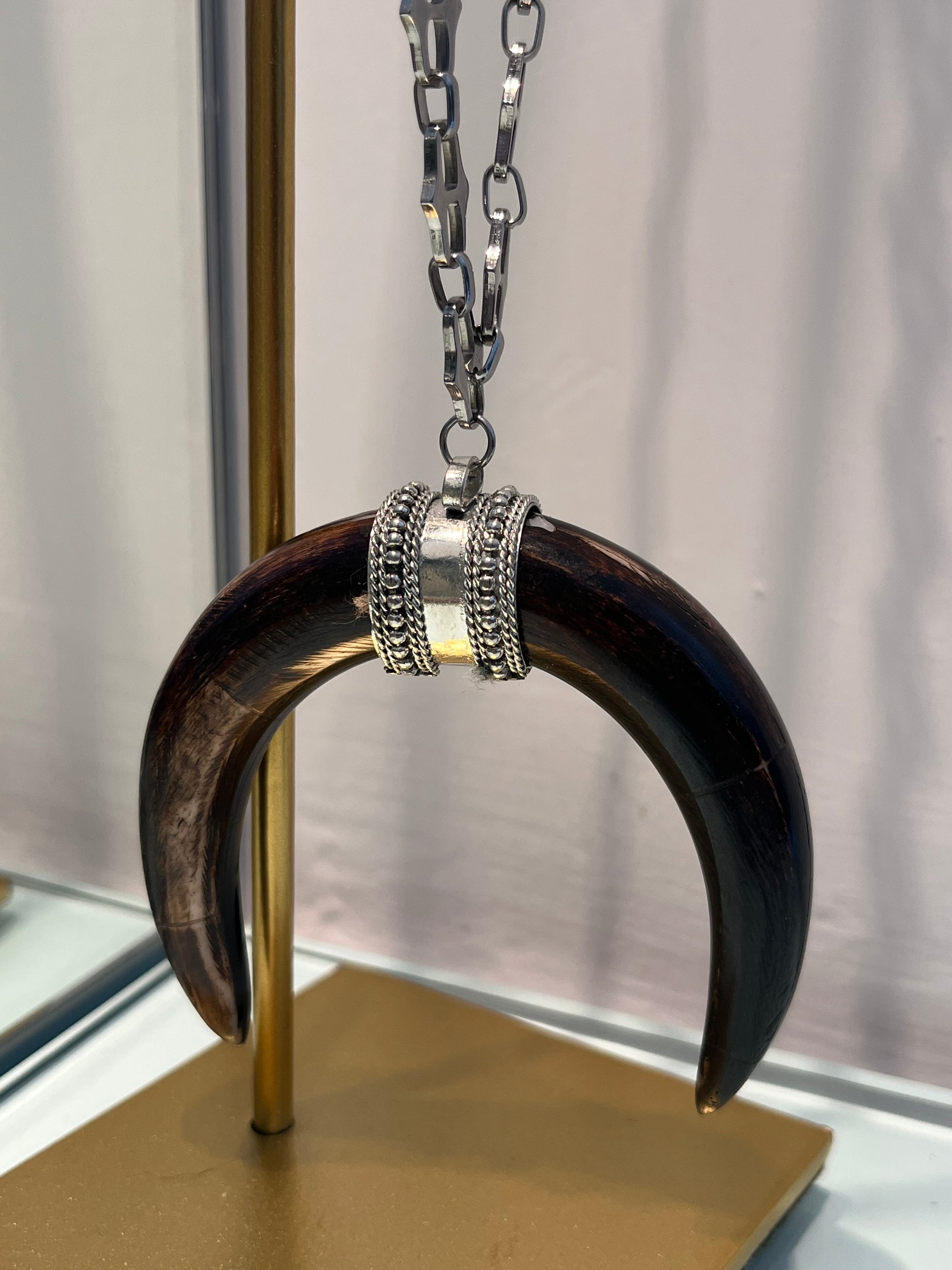 Collana in argento (lunga 80 cm) con catena e ciondolo Corno doppio in osso e legno, con attacchi argento.