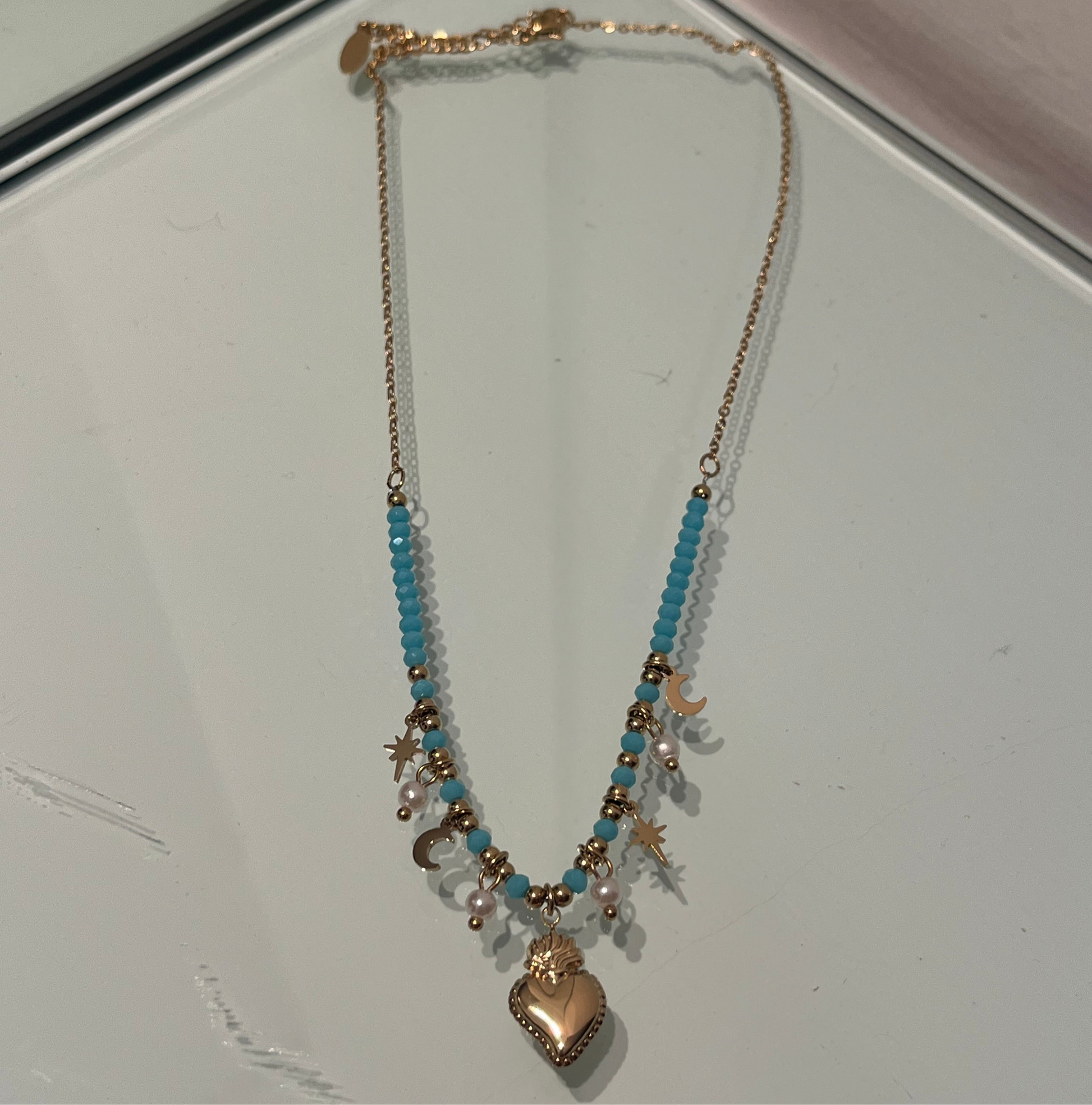 Collana color oro con perline azzurre, ciondoli oro e perle