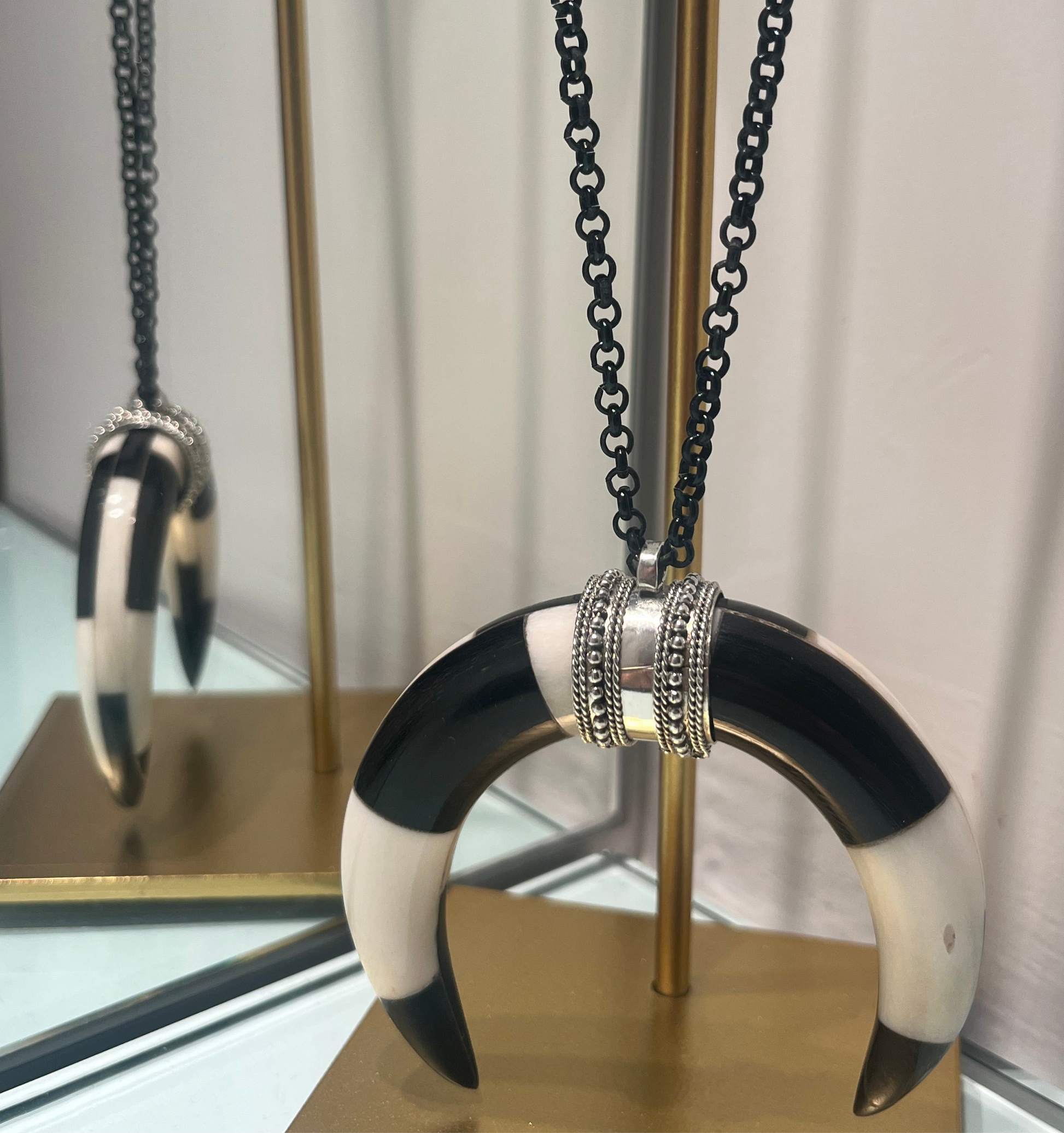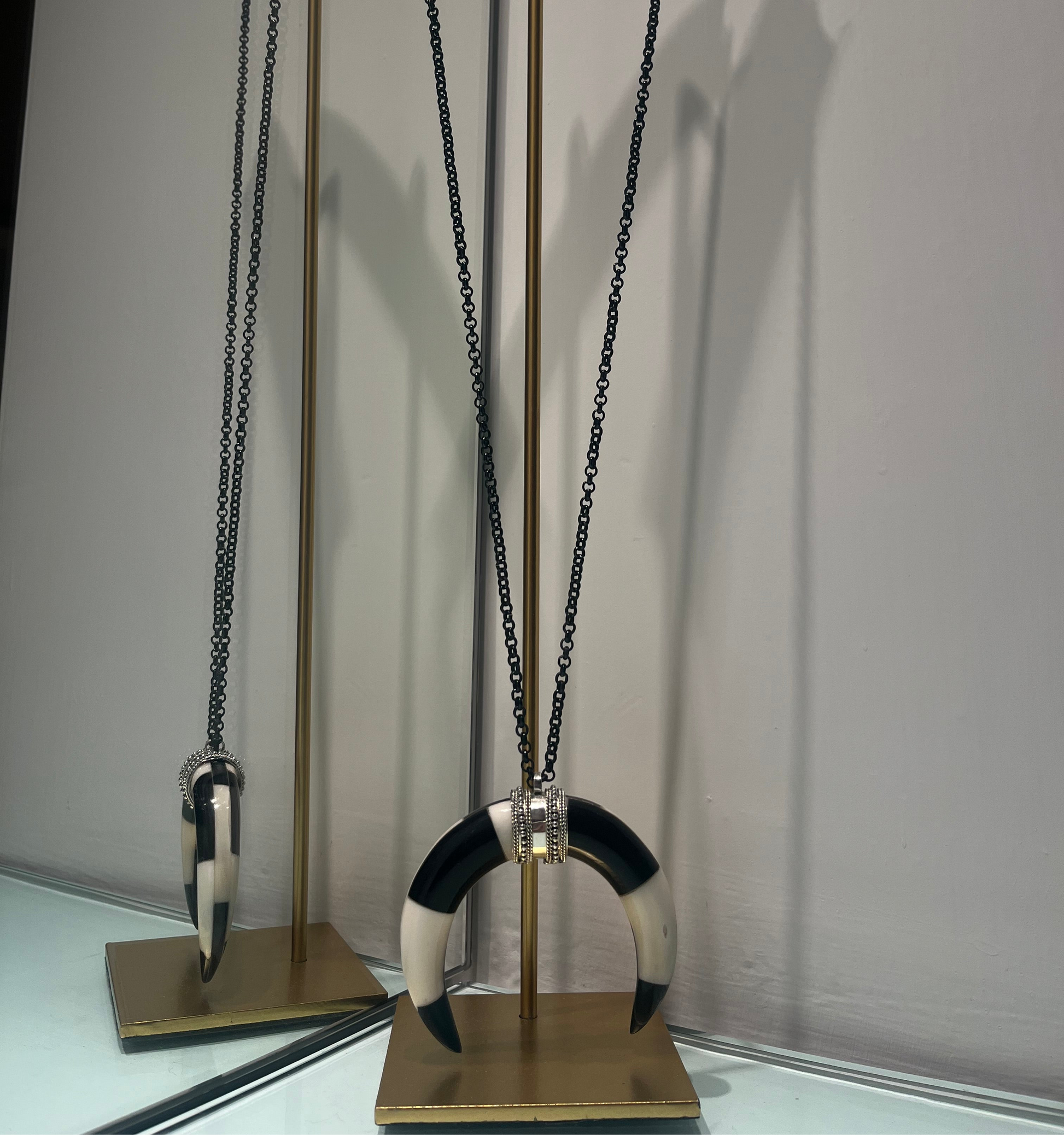Collana (lunga 70 cm) con catena nera e ciondolo Corno doppio avorio e nero con attacco e chiusura argento.