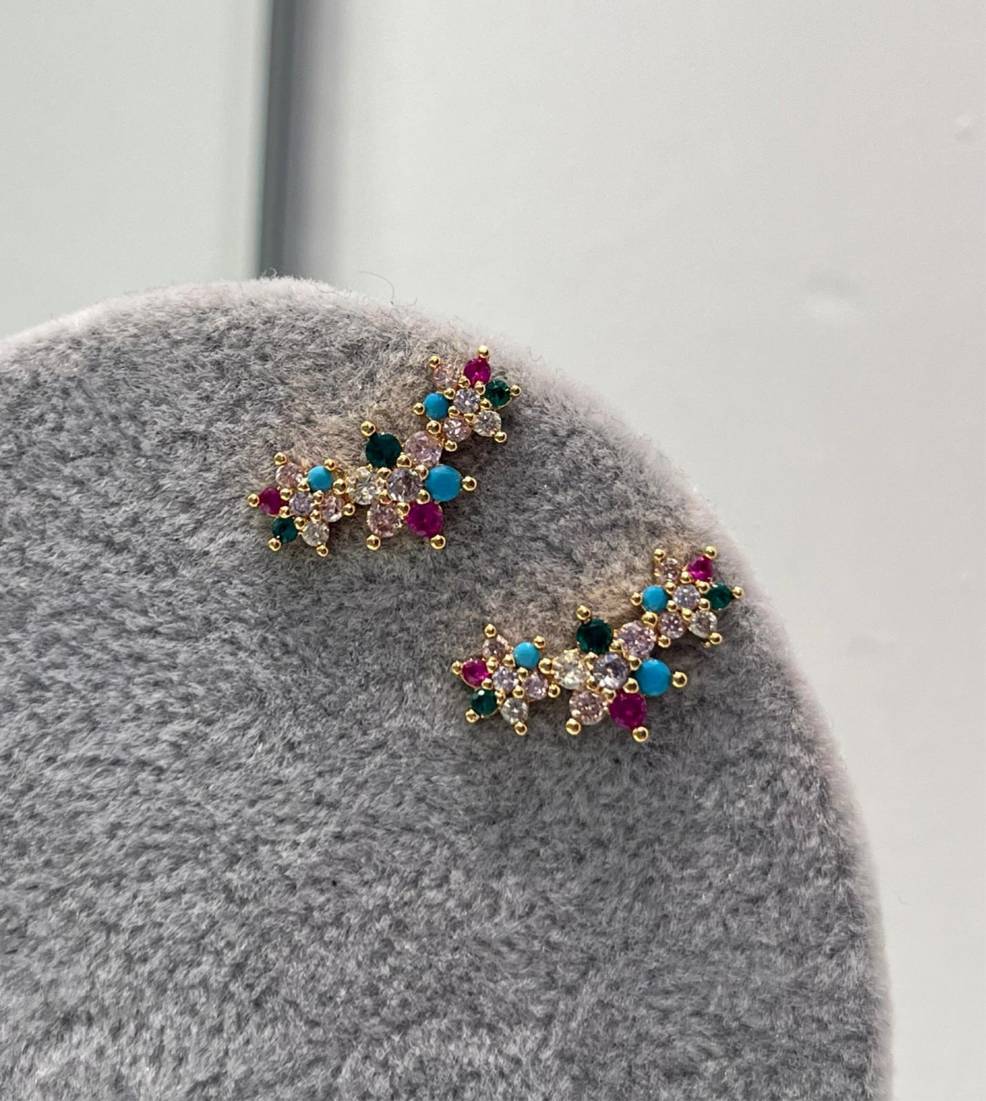 Orecchini oro per il lobo a forma di fiore con strass rainbow